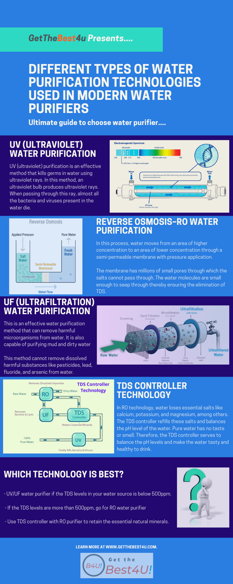 Mainly water purifiers work on an advanced and detailed filtration system that allows the separation of impurities such as dust particles and germs from raw water and makes it healthy and contamination-free. There are mainly 4 methods of water purification and all the water purifiers work on the combination of these methods only.